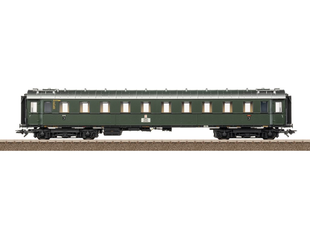 Čtyřnápravový expresní vůz C4ü (standardní konstrukce 1928–30), 3. třída, pro rychlík D 74. Deutsche Bundesbahn (DB). Provozní stav kolem roku 1955. Model