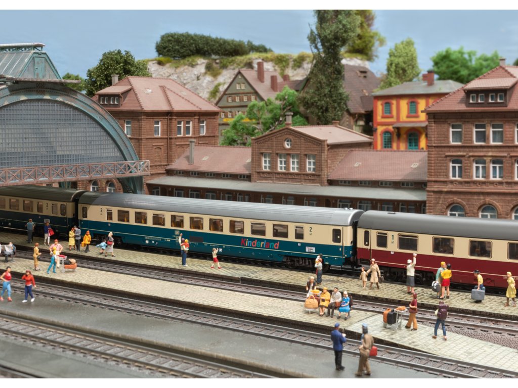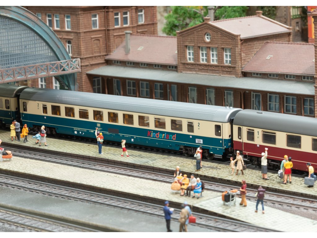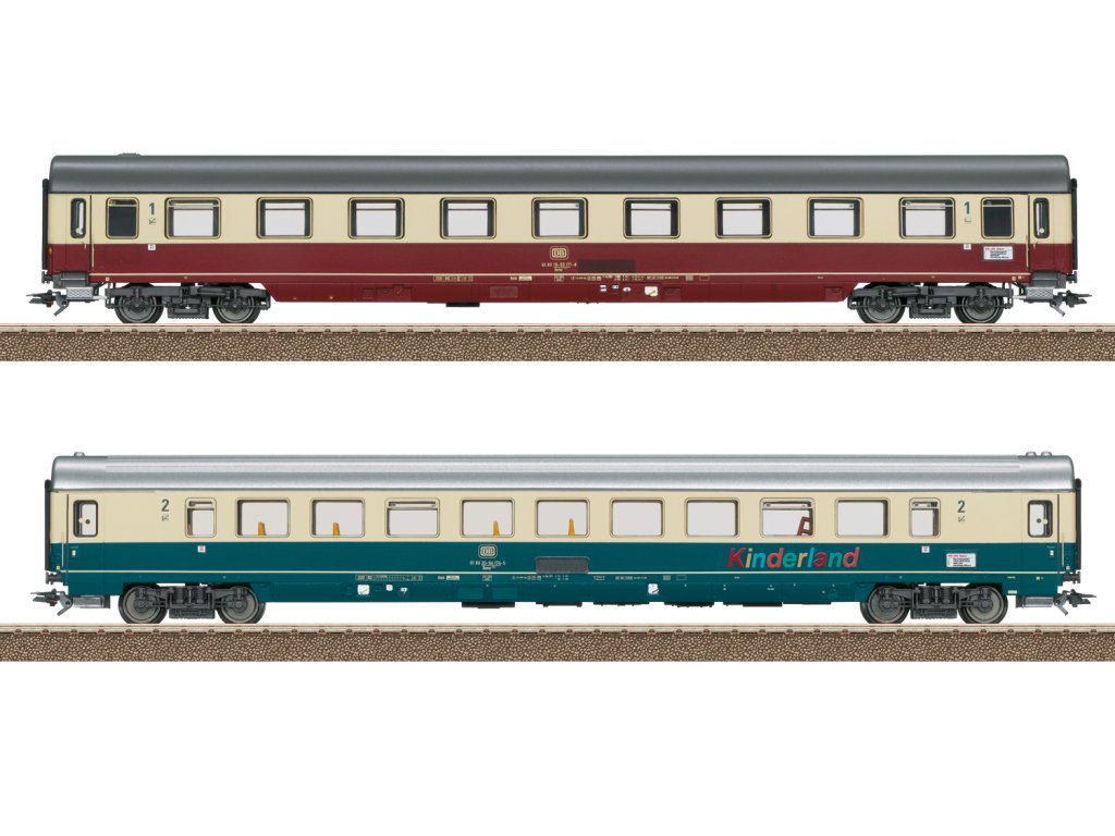 Dva osobní vozy různých konstrukcí Fern Express FD 1980 Königssee. Kabinový vůz typu Avmz 111.1, 1. třída, a otevřený vůz typu Bpmz 291.2, 2. třída s oddílem Kinderland Deutsche Bundesbahn (DB). Vlaková trasa: FD 1980 z Berchtesgadenu do Hamburg Altona. Sériová čísla vozů 61 a 63. Provozní stav 1988. Model