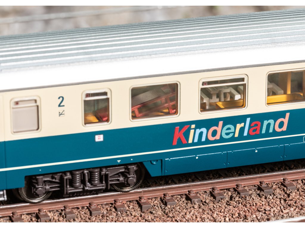 : S vícebarevným interiérem. Nově navržený interiér kombi Kinderland s odděleně připojenými detaily, jako jsou herní stoly a posuv. Oba vozy měly standardně instalované LED vnitřní osvětlení. V každém voze je instalován buffer kondenzátor pro překlenutí krátkodobých odpojených bodů. Vybavena odnímatelnými, proudově nesnoucími blízkými spřahači. Vnitřní osvětlení funguje ve spojení s jídelním vozem ze sady 23142, přičemž je nutné dodržet specifikovanou objednávku vozidel. Podvozky navržené specificky podle typu, tvary střech, boční stěny, podvozky a zástěry. Tištěné značky vozů a sériová čísla. Minimální ovladatelný poloměr 360 mm. Oba vozíky byly jednotlivě zabaleny v dalším vnějším obalu. Délka přes nárazník přibližně 56,4