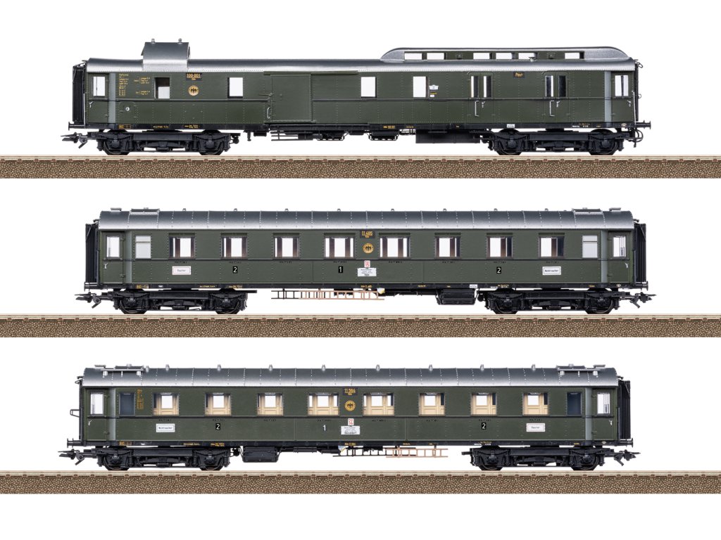 2 čtyřnápravové expresní vozy AB4ü-28, 1./2. třídy, podle standardního návrhu z let 1928 až 1930 (pracovní skupina 29), 1 čtyřnápravový vůz pro zavazadlová a poštovní vozidla PwPost4ü-28. Deutsche Reichsbahn-Gesellschaft (DRG). Všechny vozy mají základní hnědozelené nátěry. Dálkový expresní vlak FD 226 s vlakem Berlín-Hannover-Hamm-Wuppertal/Elberfeld-Kolín. Provozní stav v polovině 30. let.